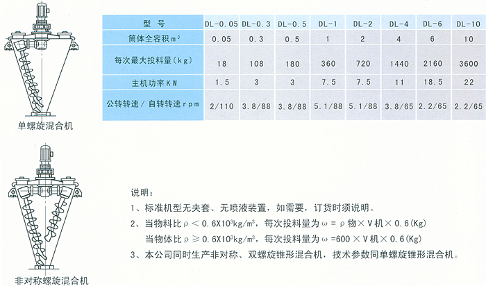 一食品工业:小麦粉、谷物、奶粉、香料、咖啡、味精、食盐等的混合物。一干燥行业:粉料的干燥。一化工工业:药品、化妆品、洗涤剂、涂料、树酯、玻璃硅、颜料、塑料、添加剂等行业的混合。 性能特点 一该机适用于固(粉)—固(粉)(粉体粒度300~2000um)混合及固(粉)—液(含液量<15%)的混合,特殊的夹套装置,还可作为干燥设备使用。一独有的双级双轴输出的减速机,使本机结构紧凑,外型美观,操作方便;一锥形简体以恰到好处的锥度确保物料流动形式及方便迅速出料,无滞留;一设备内部结构设计匠心独具,始终保证单螺旋产品运行可靠,维护方便;一混合速度快,一般粉体混合只需10分钟左右;一手动、电动、气动出料方式供你选用。