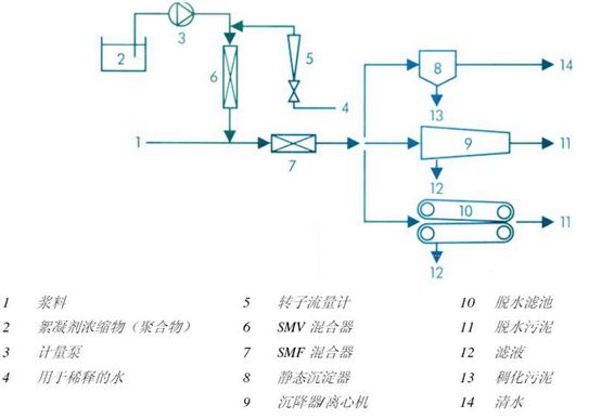 为使絮凝剂具有最佳的活性,在将其加入到污水之前,必须使用体积为10-100倍的水来稀释。由于初级溶液在一般情况下都为高粘度溶液,在水中不能够自动的被稀释,因此要确保混合的彻底性。高分子聚合物在水中分布越均匀,则其活性也越大。使用静态混合器能够确保有效混合。静态混合器的使用能够减少絮凝剂的使用量,因此能够节省成本。